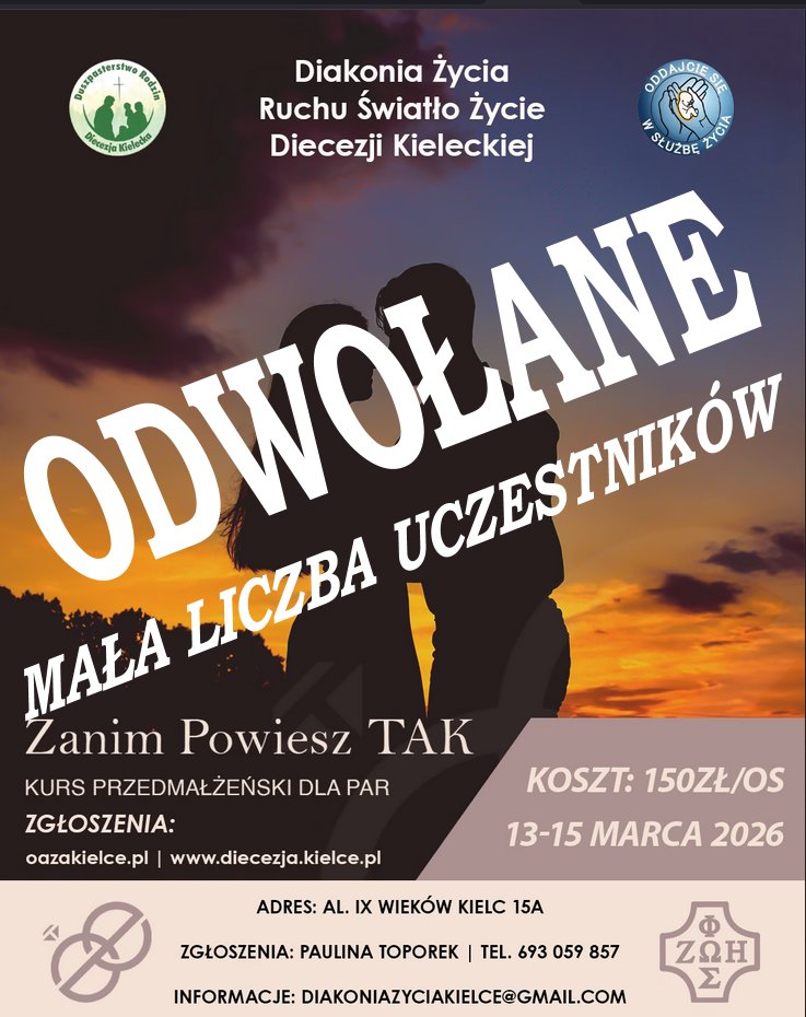 UWAGA! KURS ODWOŁANY.MAŁA LICZBA ZGŁOSZEŃ. Diakonia Życia Ruchu Światło ŻycieDiecezji Kieleckiejzaprasza wszystkich młodychna weekendowy kurs przedmałżeńskizatytułowany „Zanim powiesz Tak”. Szczegóły odnośnie zapisów na plakacie informacyjnym. Serdecznie zapraszamy! Informacje: Kurs przedmałżeński 13-15.03.2026r. Zapisy na kurs przez formularz: https://forms.gle/3U8vAXafJUbqkdAv8 Masz pytania? Dzwoń: Paulina Toporek kom. 693-059-857 Pisz: Na adres e-mail […]